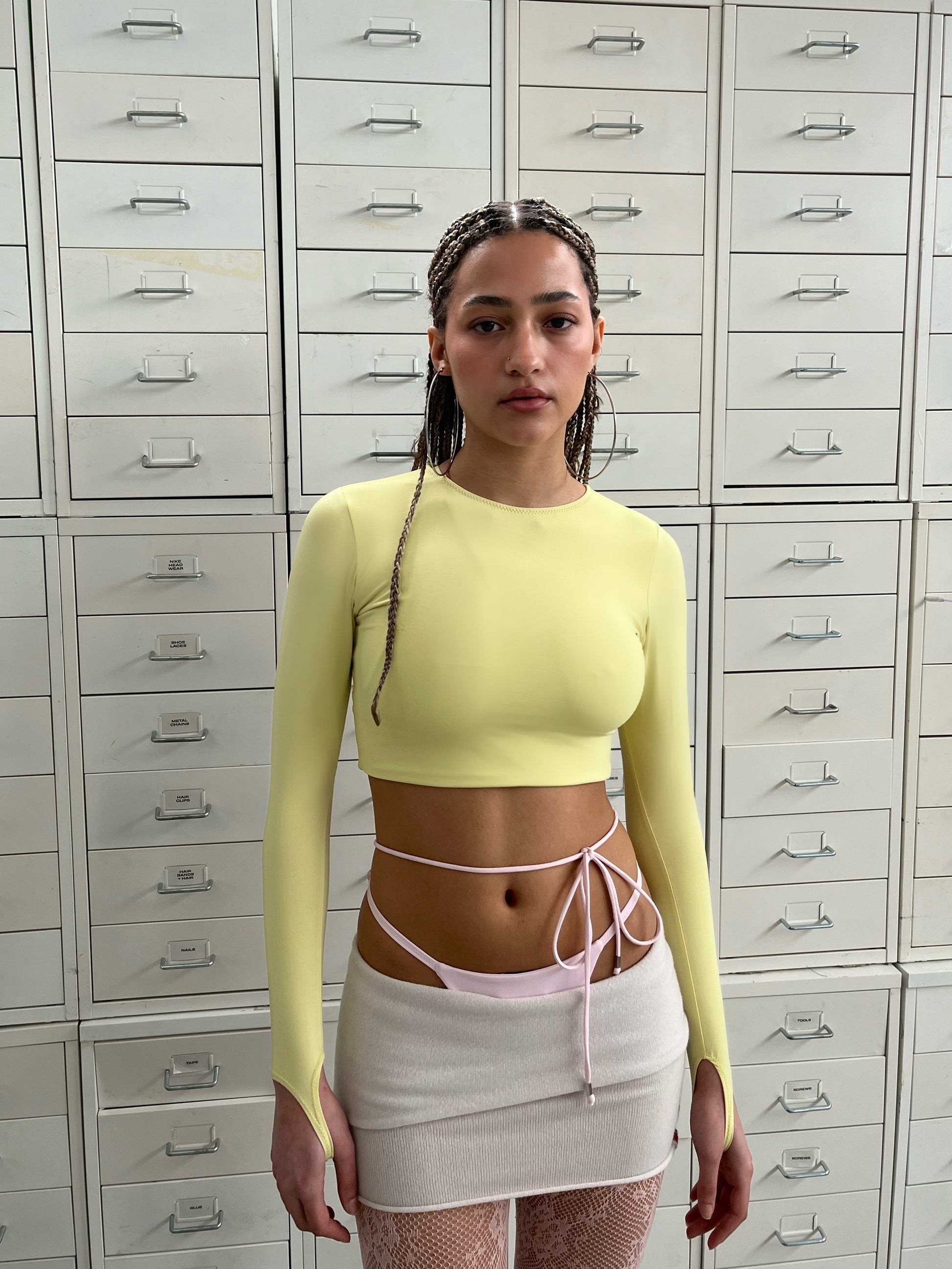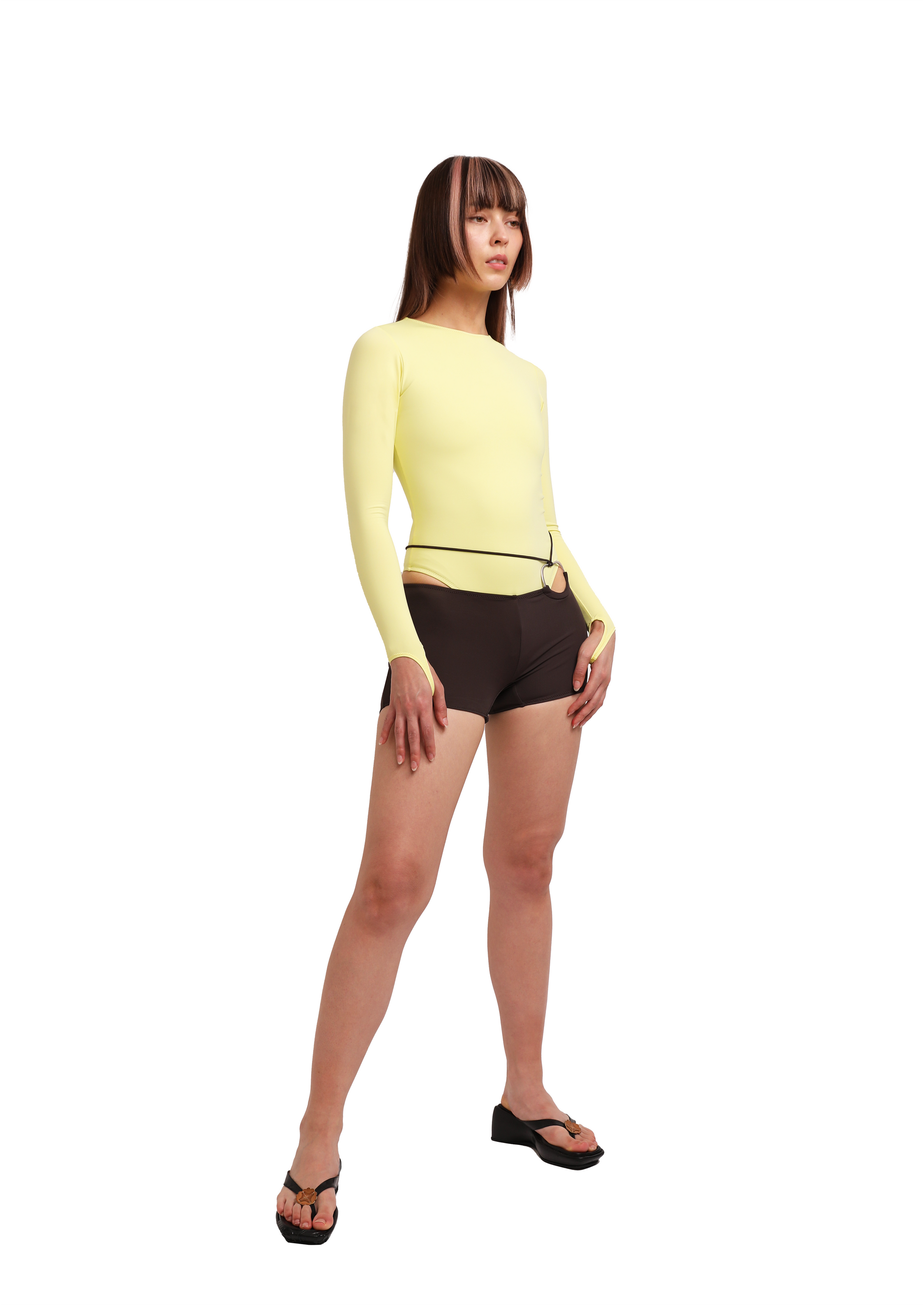 - Long sleeve yellow bodysuit with hand sling detailing.