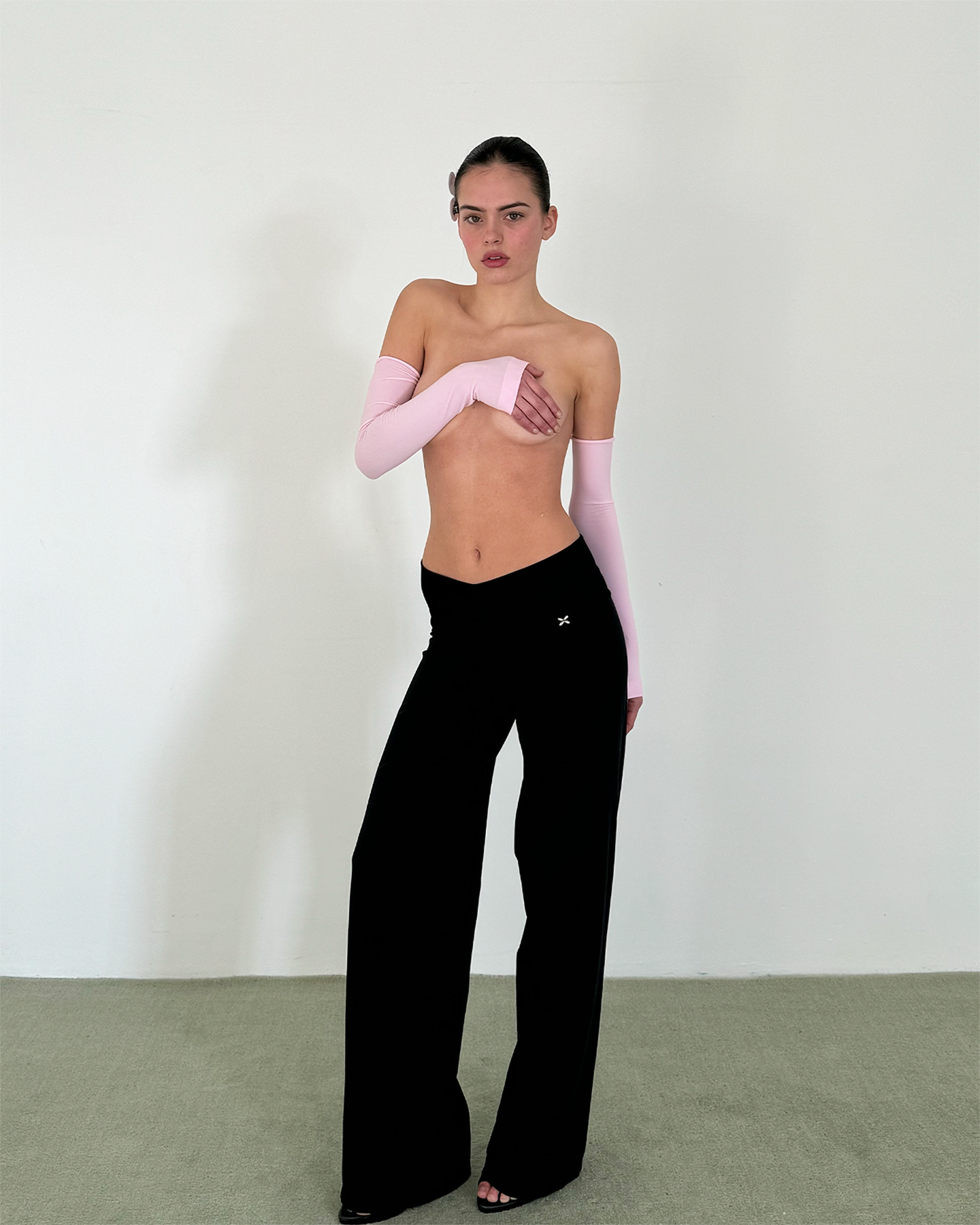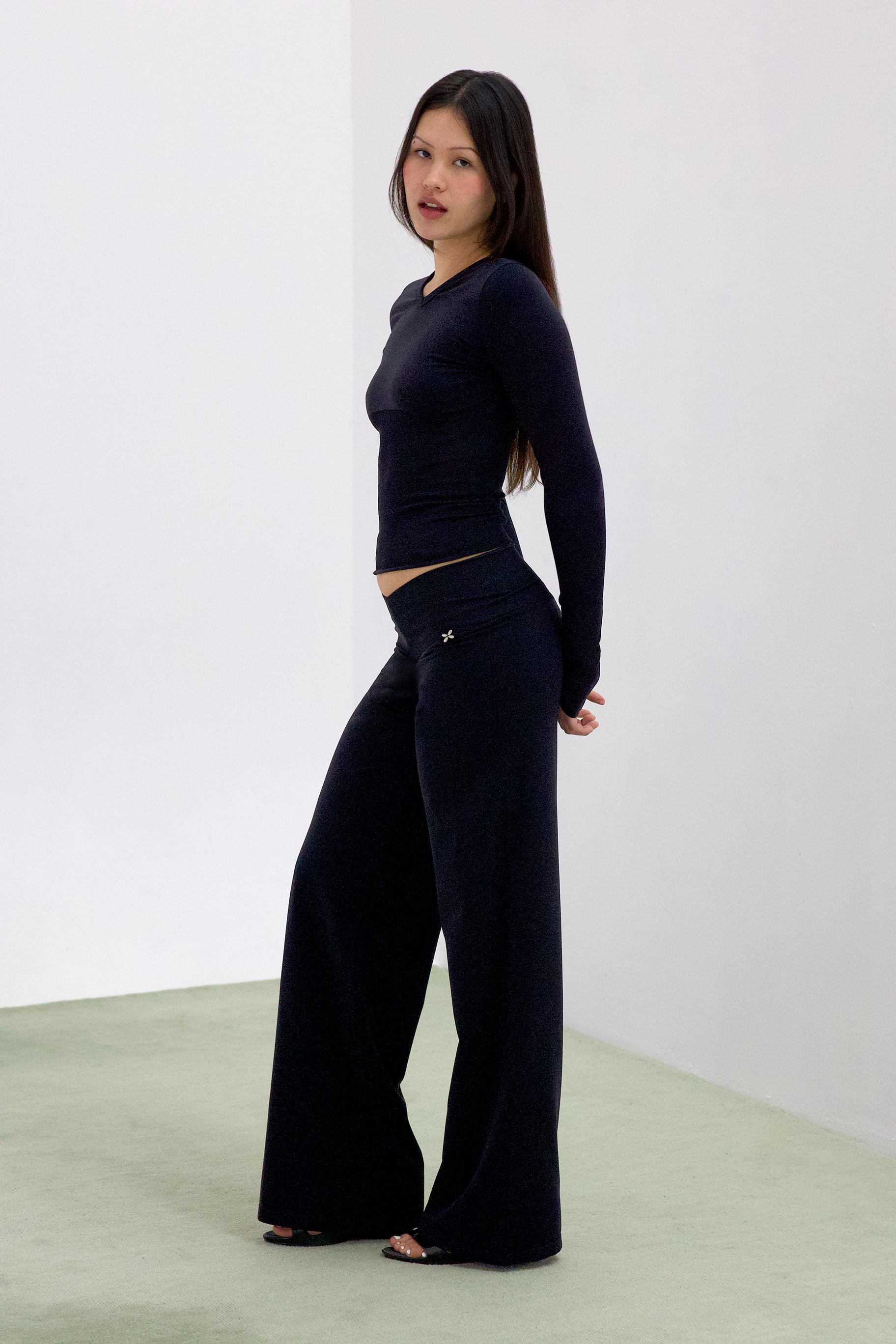 - Low-rise straight-leg pants.