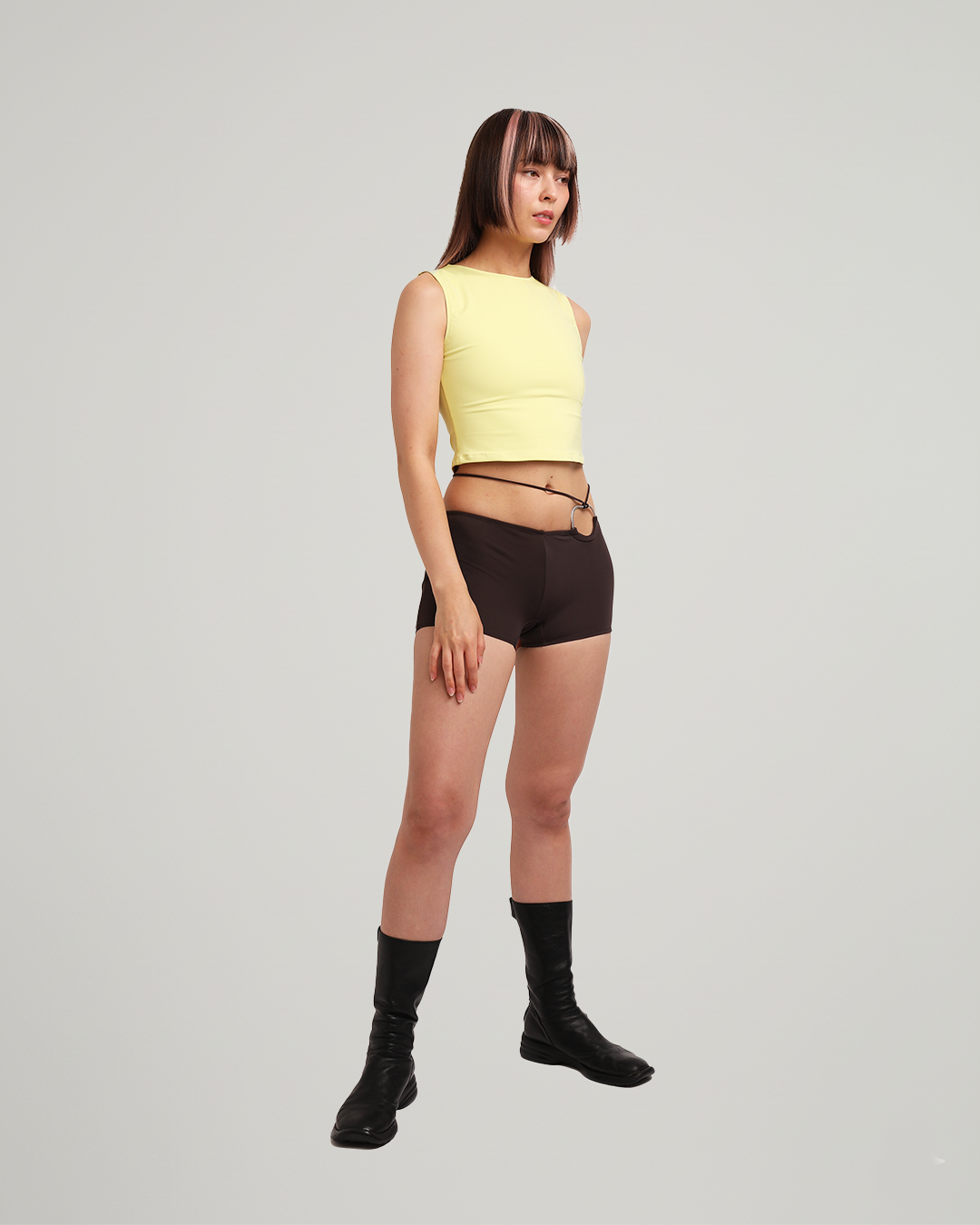 - Mid-rise yellow crop top.